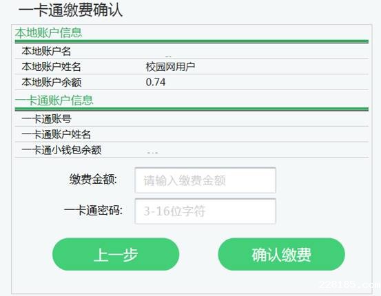 3.确认上网账户信息及一卡通账户信息后,依次填写缴费金额、一卡通密码,点击“ 确认缴费”后,在弹框中点击“ 确定”。