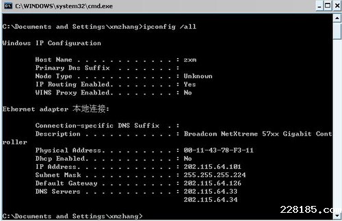 | 其中Physical Address(00-11-43-78-F3-11)指本地网卡的物理地址(MAC地址),如果IP地址是从DHCP服务器获取的,ipconfig命令将会显示 DHCP服务器的IP地址。 |