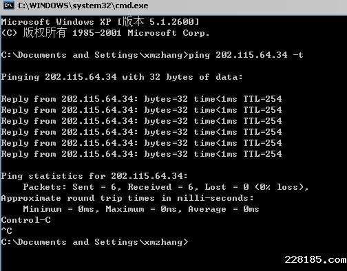 ping支持多种选项,其中常用的一个选项为“-t”,使用此选项会ping指定的目标地址直到中断。