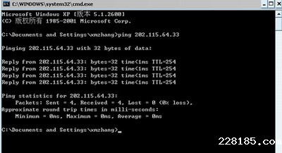 第三步:在DOS界面中输入ping 命令,在ping后面跟一个IP地址或URL(网址),例如ping 202.115.64.33。