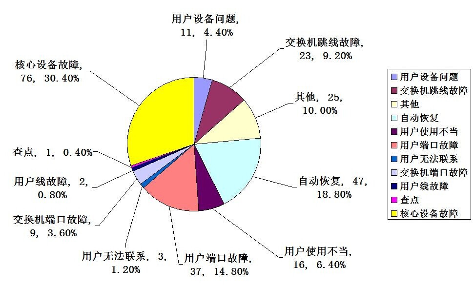 2014年6月,用户服务部共受理用户网络故障354个(不包括电话处理的咨询及上网故障),其中犀浦校区250个,九里校区104个。各类故障分布如下图所示。