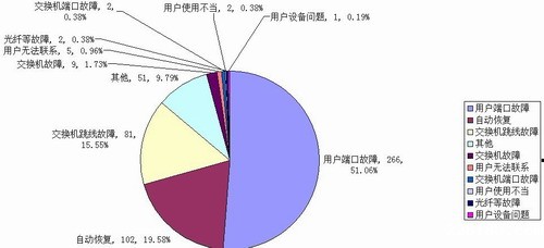 2013年4月,用户服务部共受理用户网络故障620个(不包括电话处理的咨询及上网故障),其中犀浦校区521个,九里校区99个。本月由于天佑斋片区实施改造工程,在调整线路时不可避免会对上网用户造成一定的影响,故障申报数量也有所增加。