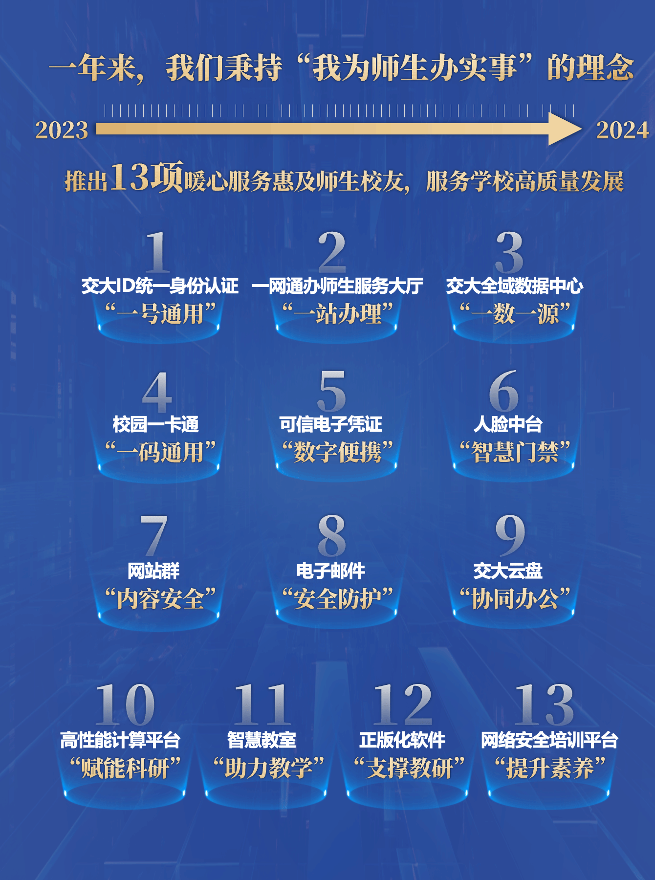 2023年,学校依托智慧校园的“数智”管理,推出“交大ID统一身份认证”、“一网通办师生服务大厅”等13项暖心服务、真心服务,以技术赋能,全力保障数字校园生活,精准服务学校高质量发展。
