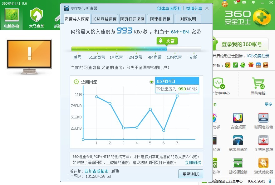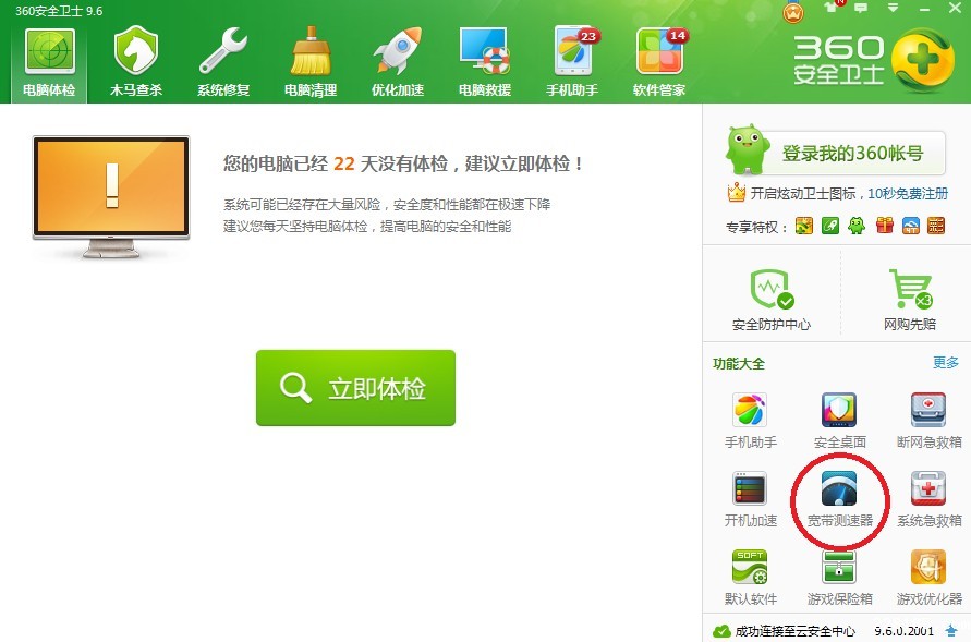 用户安装360安全卫士,拨号认证上网后,用其自带宽带测速器进行测速。