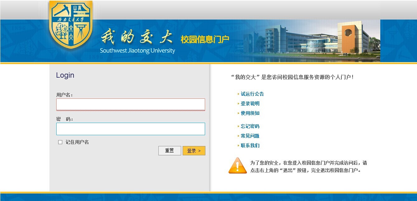 特别提示:现属于学校综合智能办公平台用户的教职工,目前登录办公平台使用的已是统一身份认证平台的用户名和密码。请使用该用户名和密码登录校园门户。建议该类用户在首次登录校园信息门户后,点击右上角的“个人设置”进行密码修改。
