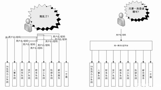 根据学校信息化建设的总体规划,不久将建立统一的用户身份认证平台,使得用户只需进行一次帐号与密码的认证即可自由的使用权限范围内的不同应用系统。而现在大家登录学校不同的应用系统需要分别输入帐号与密码,这些帐号和密码并不会强制保持一致,增加了记忆的难度。我校一个普通在岗职工需要记忆:校园网上网帐号和密码、一卡通帐号和密码、电子邮箱帐号和密码、个人财务系统的账户和密码等;若是在岗授课教师还需要记忆本科教务管理系统的帐号和密码、研究生管理系统的帐号和密码等;各个业务部门的工作人员还需要记忆与本部门有关的各种业务系统的帐号和密码;开通个人主页的教师更新自己主页内容,又得再记忆一套账号和密码;领导们和有关人员还得牢记学校办公自动化(OA)系统的账号和密码。由此可见,众多的帐号和密码造成用户记忆的困难和管理的不便。在统一用户身份认证平台建设完成以及门户集成多应用系统后,这些困难与烦恼将不复存在,大家此时只需要记住一个帐号和密码,即可做到“一次登录,畅游全校”,方便的访问授权范围内的应用系统和业务功能,其安全和便利可想而知。如下图所示: