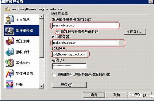 5 在使用outlook或foxmail等第三方软件进行收发邮件时,注意安装了这些软件的电脑的IP必须是交大合法的IP才能发邮件(由于某些用户帐号密码安全级别不高而被校外来的邮箱攻击破解并利用来发垃圾邮件,所以做了地址限制)。下面以foxmail为例,设置如下,在个人信息中填入电子邮件地址:采用xxx@home.swjtu.edu.cn的形式(如图6所示);在邮件服务器中填入mail.swjtu.edu.cn,注意勾选smtp服务器需要身份验证(如图7所示)。