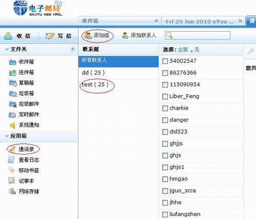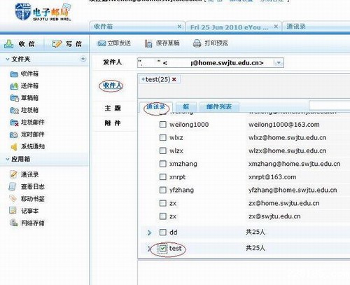 4 如果需要对通讯录中的一些联系人进行群发,首先在“通讯录”管理中建立一个联系组(如图4所示),然后在发送信件时,点击“收件人”按钮,从弹出的窗口中,将滚动条拉至最下,选择建立的联系组(如图5所示),就可以群发了。