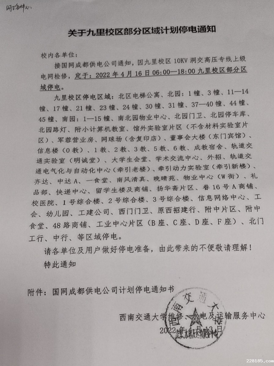 根据学校维修、水电及运输服务中心2022年4月12日通知,九里校区10KV洞交高压专线上级电网检修,于2022年4月16日6:00——18:00九里校区部分区域停电, 届时,九里校区开云体育彩票官网查询、南北园家属区及教学区等校内大部分区域将停电,受此次停电范围大、时间长的影响,本周六(2022年4月16日)6:00起将停止南北园家属区、扬华斋宿舍区、馆外实验区、教学区、牵引动力实验室等区域有线及无线网络服务。校园网络将在供电正常后恢复。