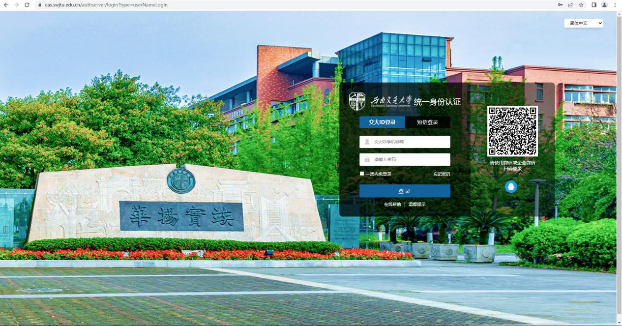 如图所示,升级后的系统界面更加清新明亮,采用了学校标志性建筑风景图片,加上现代化的设计风格,对于使用者来说更加舒适、友好。此外,界面的布局也更加合理化,除保留原有功能外,新增了微信、企业微信二维码扫码登录功能,使登录更加的方便、快捷和安全。