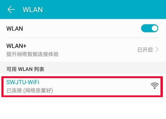 进入“设置”->打开“WLAN”开关->在可用WLAN列表中选择“SWJTU-WiFi”信号并连接。