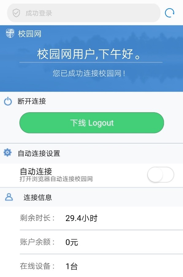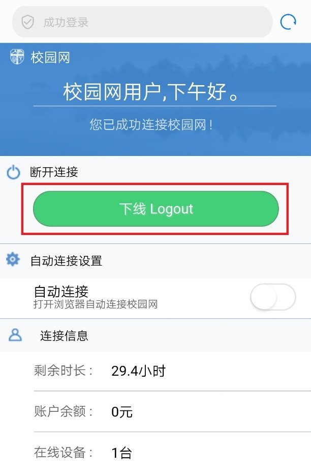1、网络使用完毕,请务必关闭无线网络(WLAN)开关或者点击“下线Logout”,否则将持续计时计费。