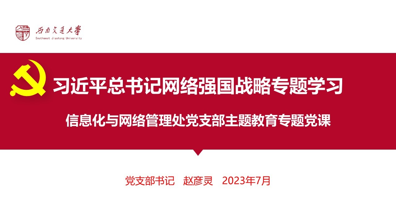 首先,赵彦灵同志作题为“习近平总书记网络强国战略专题学习——开云体育彩票官网查询党支部主题教育专题党课”的报告。赵彦灵同志以党的十八大以来网络强国战略简述、党的二十大将数字化教育写入党代会报告、站在复兴交大为己任的高度担当履职三个部分,解读了习近平总书记网络强国战略,特别是习近平总书记在党的二十大报告中着重强调:要推进教育数字化,建设全民终身学习的学习型社会、学习型大国。当下,我国正深入实施教育数字化战略行动,推动教育变革和创新,加快建设人人皆学、处处能学、时时可学的学习型社会、学习型大国。要发展信息网络技术,消除不同收入人群、不同地区的数字鸿沟,努力实现优质文化教育资源均等化。